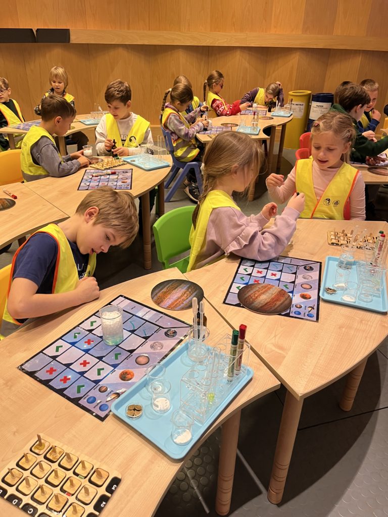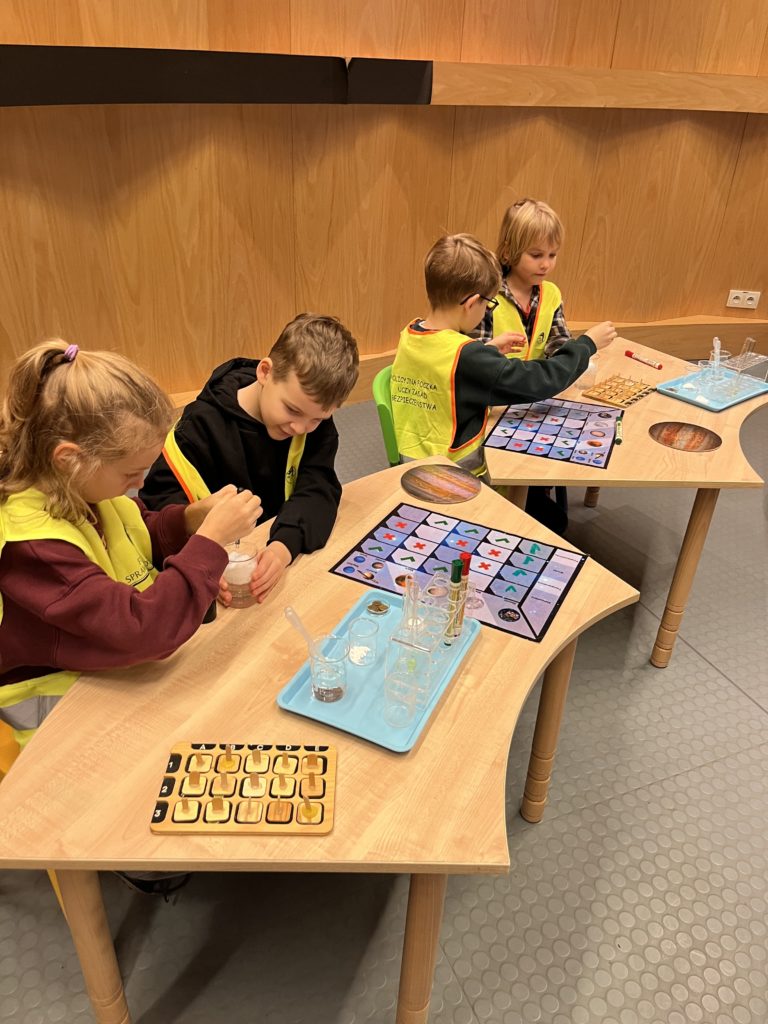 Na początku uczniowie uczestniczyli w warsztatach „ALE KOSMOS”, podczas których poznali podstawowe informacje dotyczące kosmosu, planet Układu Słonecznego oraz pracy astronautów. Mieli również okazję samodzielnie przeprowadzać doświadczenia i eksperymenty, które wzbudzały duże zainteresowanie, a niekiedy także zdziwienie.
