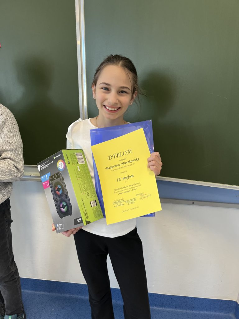 Małgorzata Mieczkowska, uczennica klasy III b, została laureatką Gdyńskiego Konkursu Ortograficznego „Mistrz Ortografii – Junior” i zajęła III miejsce.