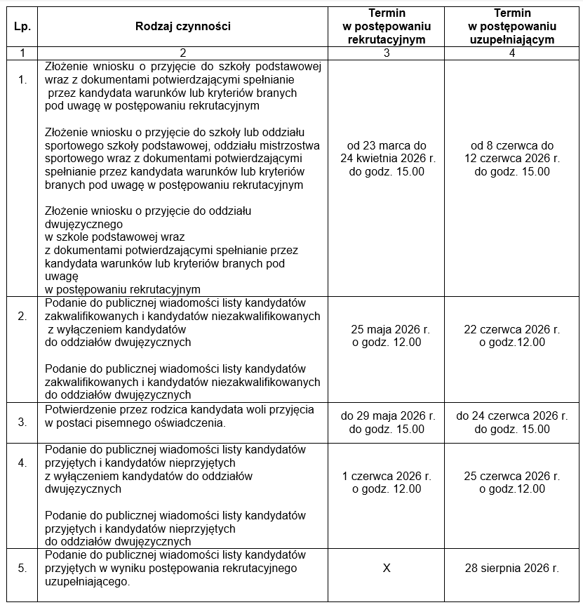 - Terminy postępowania rekrutacyjnego oraz postępowania uzupełniającego, w tym terminy składania dokumentów na rok szkolny 2026/2027 do klas I publicznych szkół podstawowych, a także klas wyższych, niż klasa I publicznych szkół i oddziałów sportowych, mistrzostwa sportowego i oddziałów dwujęzycznych: